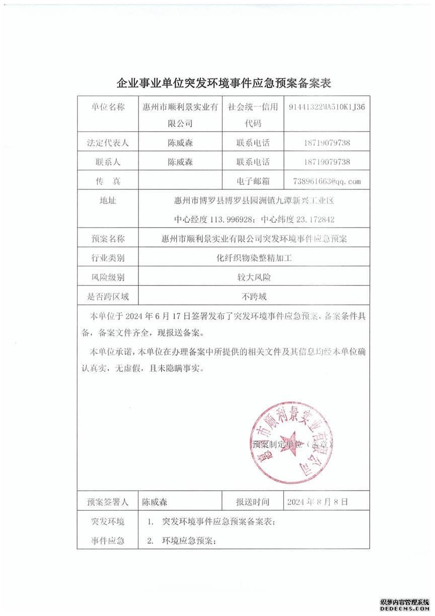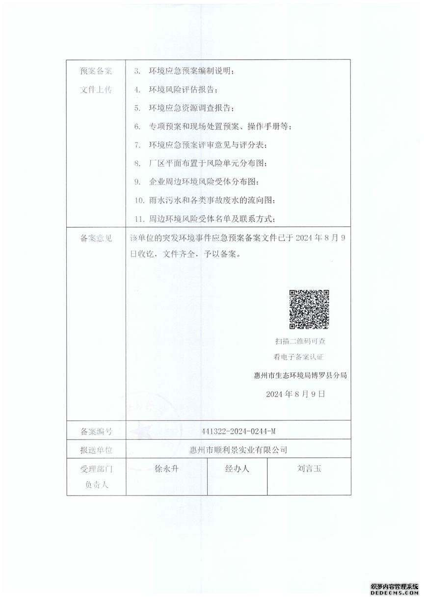 突發(fā)環(huán)境事件應(yīng)急預(yù)案    已制訂《惠州市順利景實業(yè)有限公司突發(fā)環(huán)境事件應(yīng)急預(yù)案》,并于2024年 8月9日在博羅縣環(huán)境保護局備案,