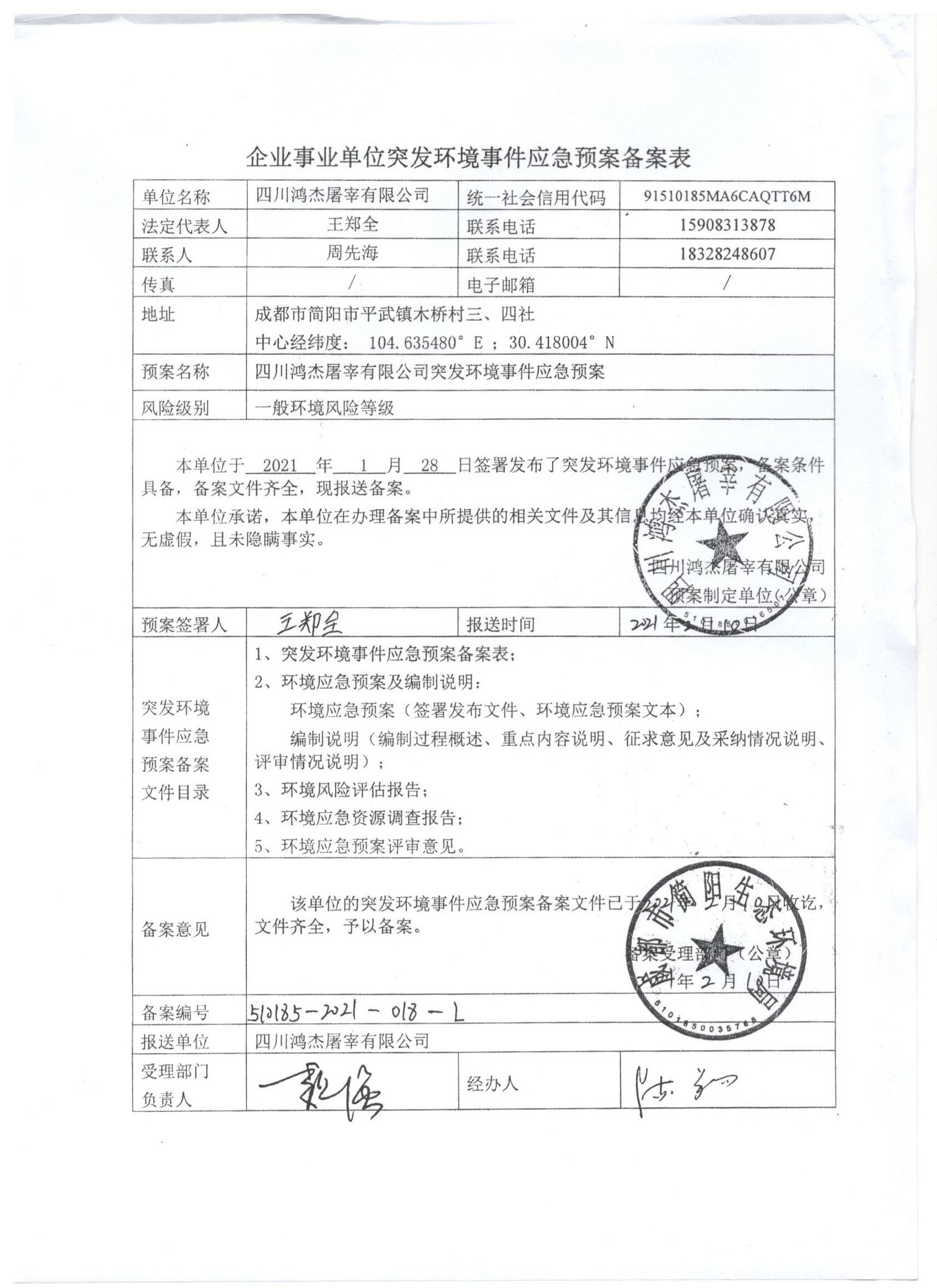 已制訂《四川鴻杰屠宰有限公司突發(fā)環(huán)境事件應(yīng)急預(yù)案》,并于2021年 2月 12日在成都市簡陽生態(tài)環(huán)境局備案, 備案編號:510185-2021-018-L |