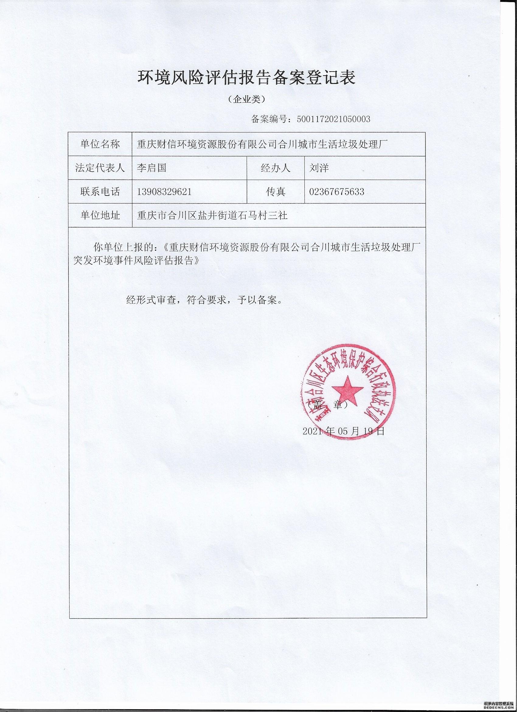 已制訂《重慶財信環(huán)境資源股份有限公司合川城市生活垃圾處理廠環(huán)境風(fēng)險評估》,并于2021年 5月20日在合川區(qū)環(huán)境保護(hù)局備案, 備案編號:5001172021050003 |